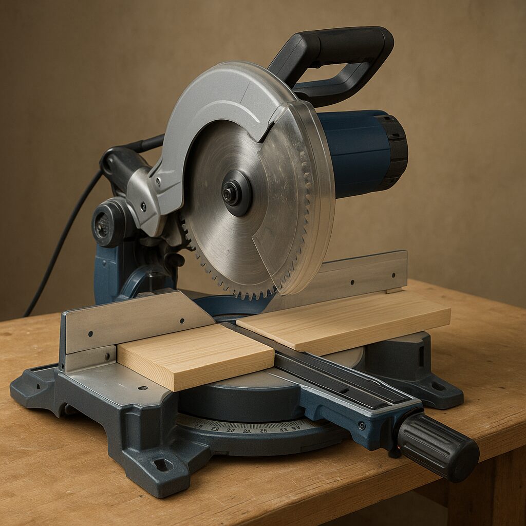 - Cięcie pod kątem w płaszczyźnie pionowej – pochylamy głowicę tnącą w lewo lub prawo, co pozwala ciąć materiał pod skosem w pionie, np. przy obróbce ościeżnic, boazerii.